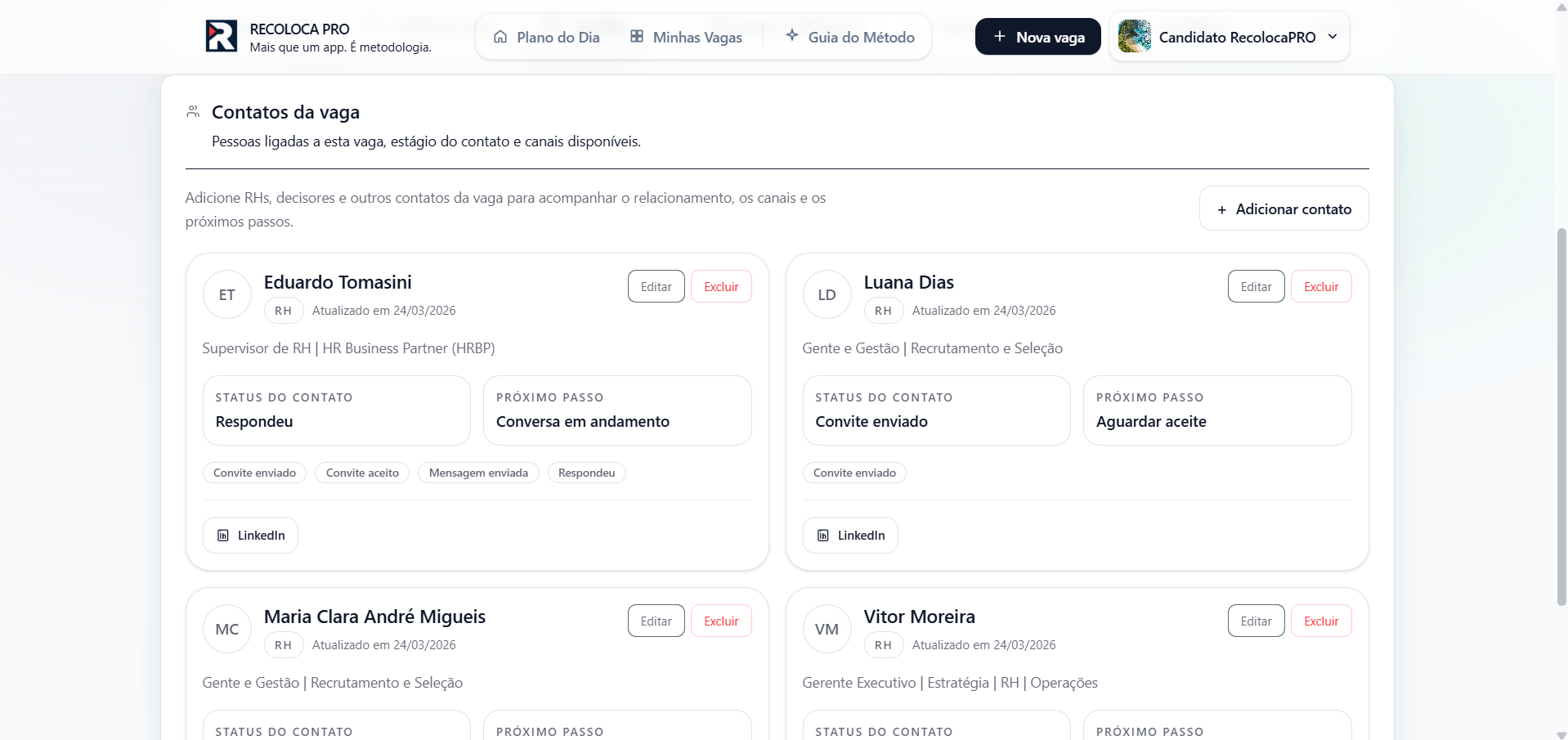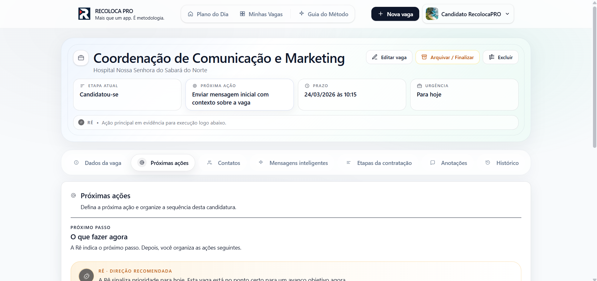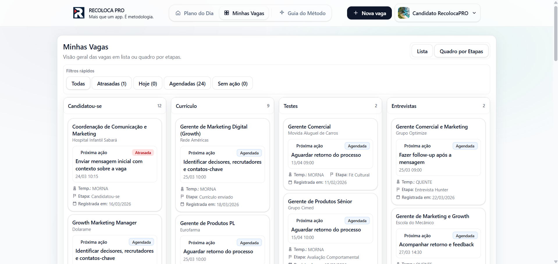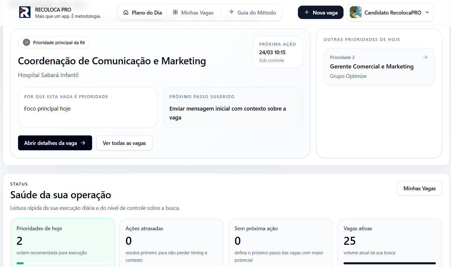 O RECOLOCA PRO não adiciona mais tarefas — ele organiza o que realmente faz sua busca avançar.